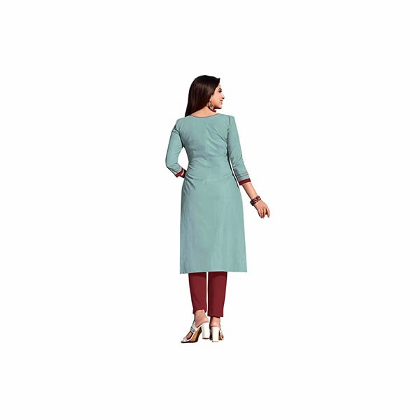 The Kurti is designed using pure cotton, which makes it soft and breathable. The softness of the fabric and its breathability give the dress a comfortable feel.