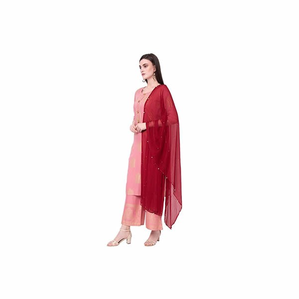 Women's Rayon Gold Printed Kurta And Palazzo With Chiffon Dupatta Set