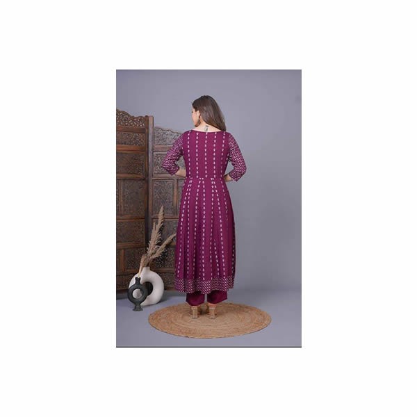 This lovely women's anarkali kurti with pant and dupatta set from AMAZON.IN will breathe new life into your wardrobe. This ethnic set gives you a sophisticated appearance and completes your wardrobe. This item is made from fabric that is entirely rayon. This fabric is gentle on the skin. Due to varying screen resolutions, there can be a minor change in the product's true colour.