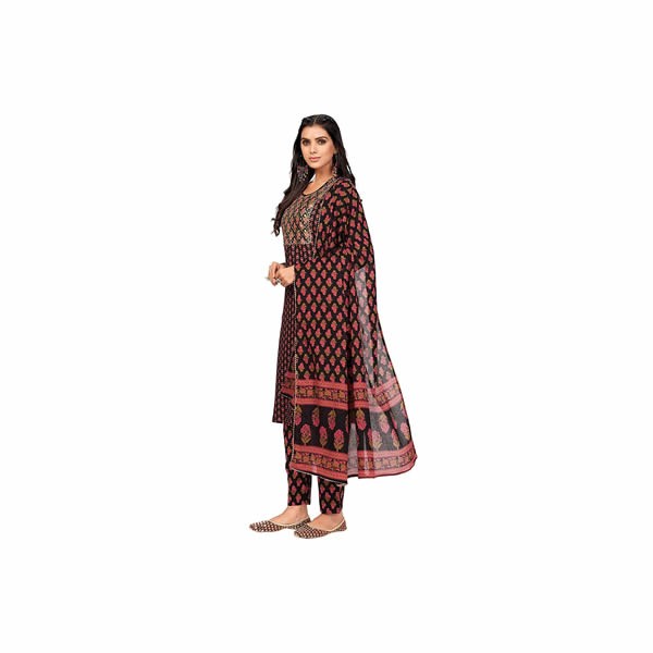 Vbuyz Women's Print & Sequience Straight Cotton Black Stitched Kurta Pant With Dupatta has a Round Neck, 3/4 Sleeves, Print & Sequience, Straight Hem, Side Slit. It will keep you comfortable for a party wear look. Pair it with high heels and look effortlessly chic and fashionable.