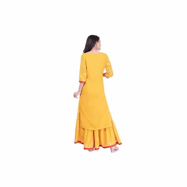 This kurta set is a gorgeous ensemble of flowing rayon that will make you glow. The ankle length kurta features with round neck and gotta patti work by hand.
