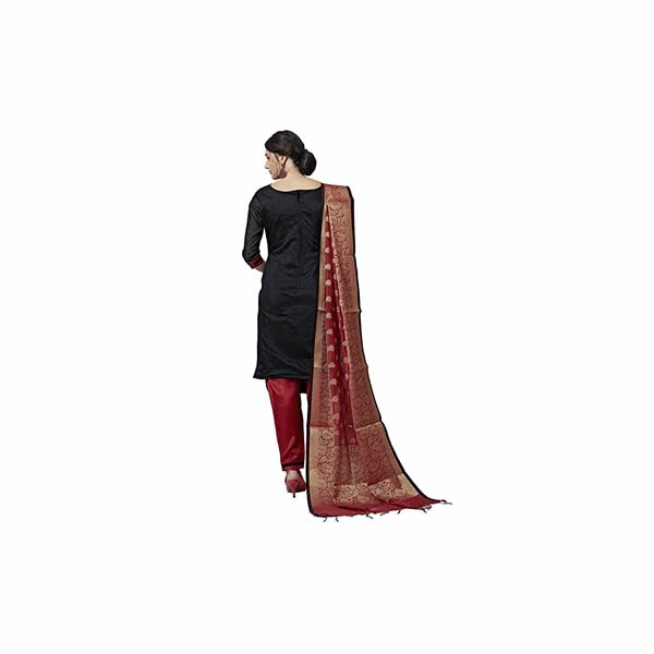 Women's Black semi stitched woven silk dress material having red color chudidar bottom of cotton fabric and maroon color Dupatta of banarasi Silk material with Black colour in banarasi Silk cotton fabric images are for the reference purpose only, color of the actual product may little vary from the image due to screen resolution.